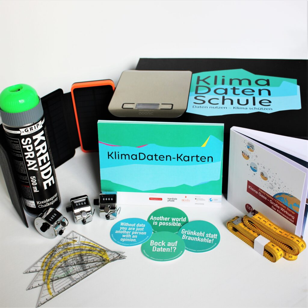 Im Rahmen des Programms KlimaDatenSchule bieten wir Schulen unsere kostenlose KlimaDaten-Toolbox an. Mithilfe der Materialien lässt sich der Zusammenhang zwischen Klimaschutz und dem Umgang mit Daten greifbarer machen, die Klimakrise veranschaulichen und dabei noch eure Daten- und Medienkompetenz weiterentwickeln. Schülerinnen und Schüler können mit der KlimaDaten-App eigene Daten zu den Themen Bäume, Mobilität, Papier und Ernährung sammeln und ausgehend davon Klimaschutz-Projekte entwickeln.