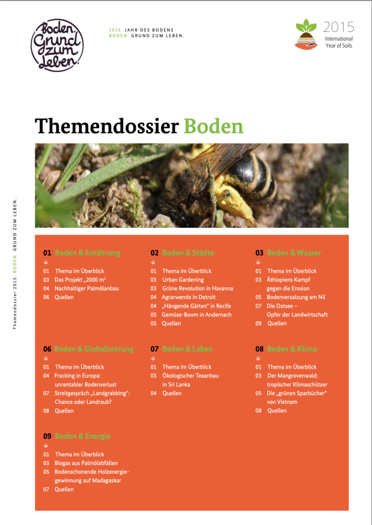 Das Themenheft bietet für Schüler*innen der Mittel- und Oberstufe einen spannenden Zugang zum Thema Boden. Je nach Unterrichtsfach und Lehrplan kann der Themeneinstieg über verschiedene Aspekte wie Klima, Wasser, Energie, Ernährung, Globalisierung und Städte erfolgen. Die einzelnen Dossiers bestehen aus Hintergrundtexten, Projektbeispielen, Interviews und Grafiken.